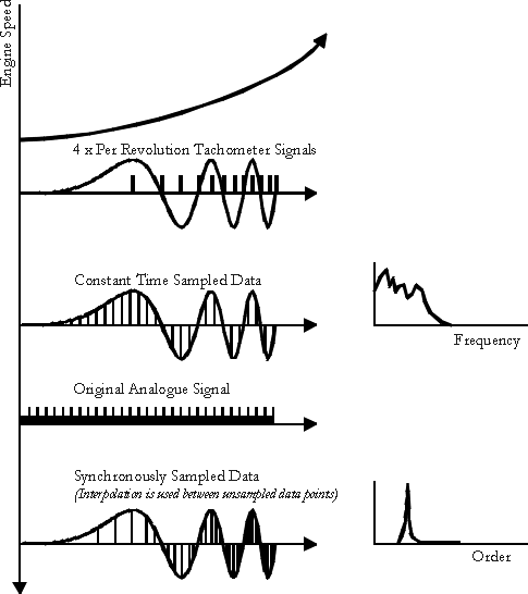 Adaptive Data ResamplingThe origins of angle data resampling lie in its predecessor, phase locked loop (PLL) analysis. Phase locked loop analysis uses a once per revolution tachometer signal, which was used to determine the rotational speed of the shaft, thus allowing vibrations to be analysed in terms of their shaft orders, and synchronous averaging to be employed. However the practicality of using a PLL is limited, as this approach is only applicable to slowly variable speed machinery. In order to overcome this limitation, angle data resampling or digital resampling [McFA86] was employed.Angle data resampling involves measurement of the rotational speed of the shaft, derived from a tachometer signal which is triggered at a fixed number of times per shaft revolution. Due to problems related to the resolution of the tachometer signal, the trigger rate of the tachometer is usually much lower than the fixed sampling rate. Because of this, the instantaneous angular position and speed at each data sample location is not accurately known [TAN89]. In order to obtain more accurate information about the location and angular speed of the shaft, various interpolation schemes have been trialed, ranging from the simple linear case to higher order polynomial interpolation. This enables intermediate angular speeds and positions to be calculated, providing the basis for resampling the data at constant angular intervals. Figure 14 shows conceptually how angle data resampling can be used to analyse vibrations from an engine during start up. Once the signal has been transformed into its angle domain, the FFT can be applied to analyse the order spectrum of the vibrations.