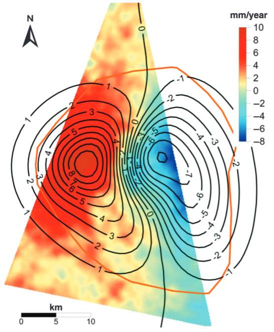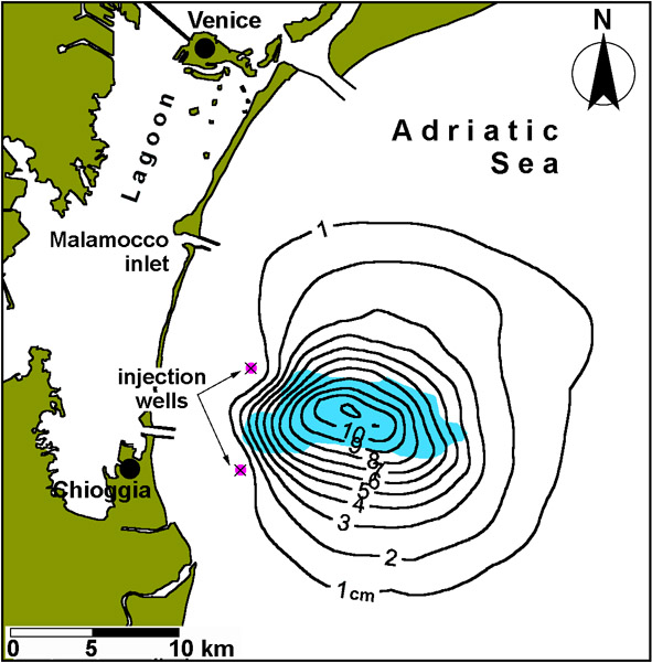 of a quite uniform 26 cm uplift 10 years after pumping inception.
